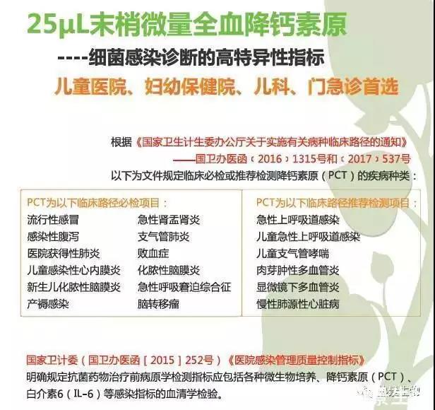 1、 广泛应用于败血症的诊断和预后、新生儿与儿童败血症的诊断治疗、下呼吸道感染诊断治疗、重度烧伤与创伤脓毒症的检测、抗生素的使用管理等方面;