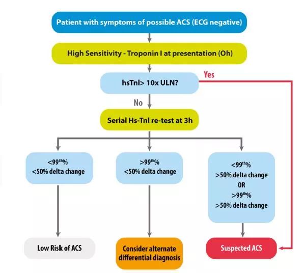 就诊即刻(0h)检测一次cTn,若>正常上限的10倍,则高度怀疑ACS,反之,可3h后再次检测cTn。