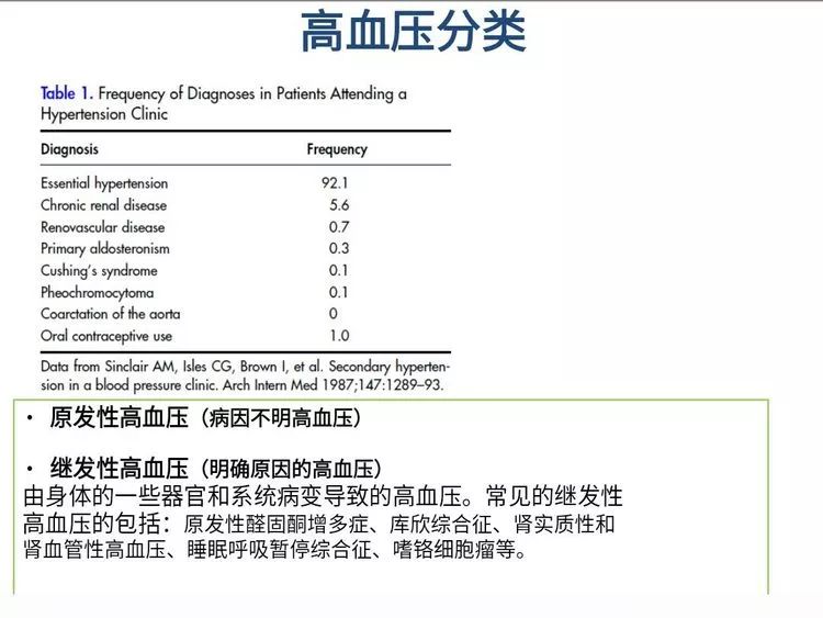 高血压可分为原发性及继发性两大类。90%的高血压患者病因不明,称之为原发性高血压;而不足10%患者血压升高是某些疾病的一种临床表现,有明确而独立的病因,称为继发性高血压。临床上对高血压患者,除了详细寻问患者病史外,还会进行全面的体格检查,尤其是做一些辅助检查,查明引起血压异常升高的病因,鉴别原发性与继发性高血压。