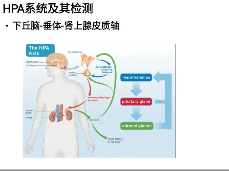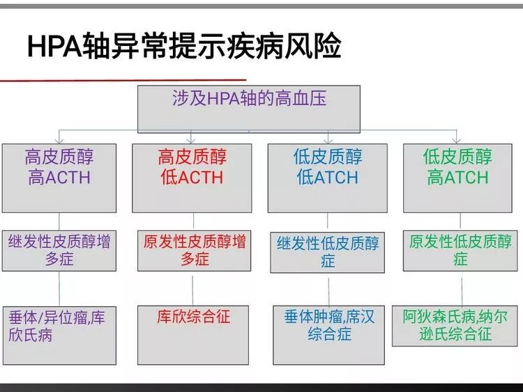 机体应激时,通过HPA轴释放促肾上腺皮质激素释放激素(CRH),后者使垂体释放促肾上腺皮质激素(ACTH),ACTH作用于肾上腺皮质使其释放糖皮质激素。糖皮质激素又反馈抑制下丘脑、垂体释放肽类激素,以达到自稳作用。HPA轴的紊乱会导致皮质醇增多症、嗜铬细胞瘤、原发性醛固酮增多症、先天性肾上腺皮质增生等肾上腺疾病,引起继发性高血压。因此检测HPA轴对继发性高血压的诊断有重要的意义。