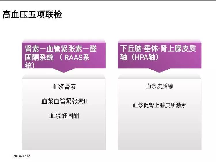 肾素、血管紧张素、醛固酮三者是一个相连的作用系统,称为RAAS系统,通过对血容量和外周阻力的控制,调节人体血压、水和电解质平衡,来维持机体内环境恒定,所以检测RAAS指标对高血压的诊断有重要的意义。高血压五项包括血浆肾素、血浆血管紧张素、血浆醛固酮、血浆皮质醇、血浆促肾上腺皮质素的检测。