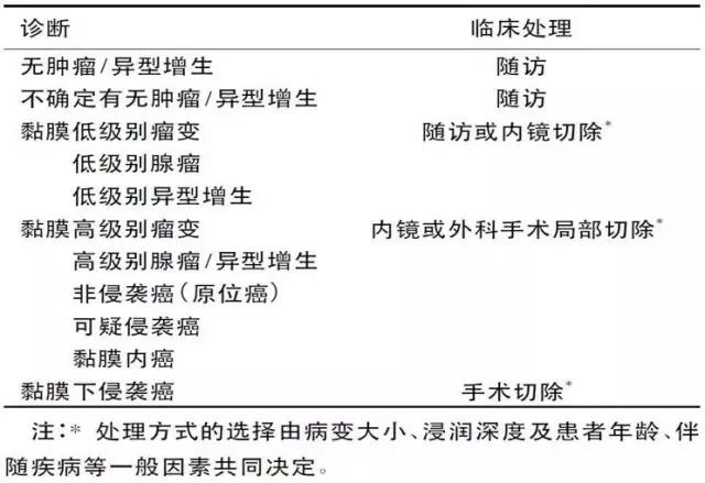 而不同的状态其治疗方案不同,根据1998年维也纳胃肠上皮肿瘤病理分型标准(见下表),根据不同内镜和病理诊断,选择不同的临床处理方式。